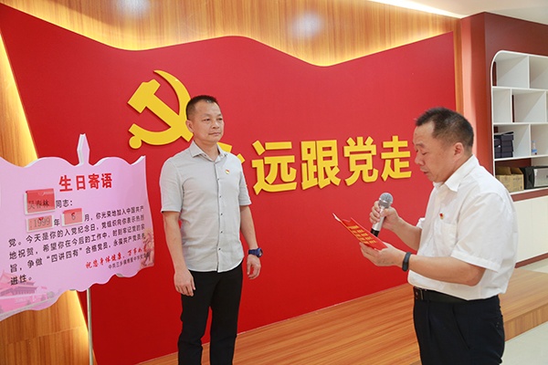 活動中,由支部書記張政同志作簡短發(fā)言,各黨員同志展開座談,接著8位6月份入黨的黨員(黃武清、丘濟新、馮燕顏、戴文慧、張秀芬、王衛(wèi)華、林蔚藍、吳春林)逐個到入黨生日祝賀牌前接受祝賀,博愛中學黨支部的5名支委分別向8位6月份入黨的黨員同志獻花祝賀,送上賀卡隨后黨員同志黨在黨支部書記張政的的引領下,重溫入黨誓詞:“我志愿加入中國共產黨……隨時準備為黨和人民犧牲一切,永不叛黨!”鏗鏘有力的入黨誓詞在會場響起,震撼人心!隨后,8位黨員代表結合自身入黨經歷,發(fā)表“政治生日心語”,回顧總結了自己的工作體會和思想成長的感悟、收獲,他們個人的成長與組織的關愛已經融為一體,仿佛影片一般一幕幕展現(xiàn),令人感動。