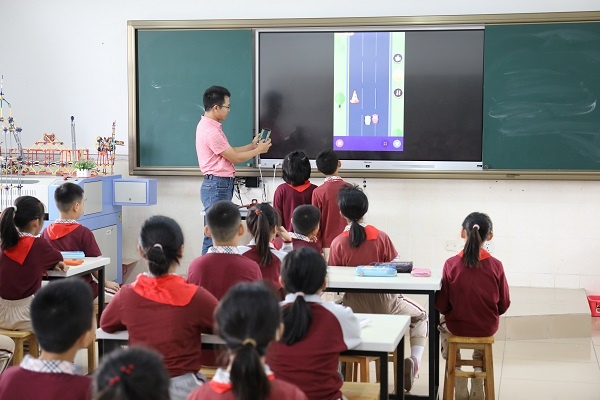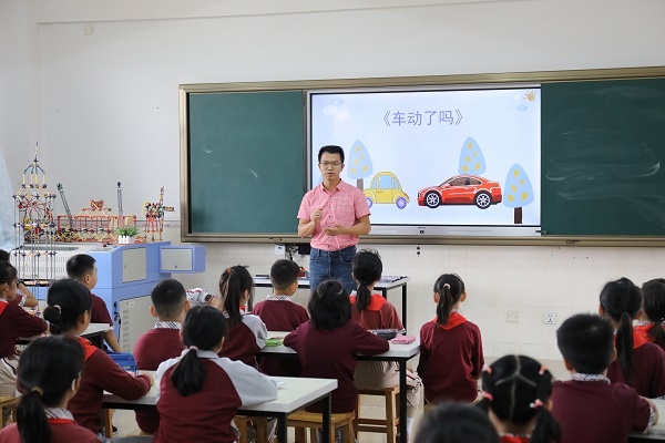 第三節(jié)課由豐華學(xué)校陳小樂(lè)老師展示四年級(jí)科學(xué)《車(chē)動(dòng)了嗎》。陳老師充分結(jié)合信息技術(shù)手段和多媒體技術(shù),讓學(xué)生體驗(yàn)并觀察其自制的賽車(chē)小游戲,學(xué)生在有趣的游戲中發(fā)現(xiàn)參照物改變,物體的運(yùn)動(dòng)狀態(tài)也會(huì)改變。接著,陳老師模擬人在公交車(chē)上的場(chǎng)景,讓學(xué)生分析并模擬場(chǎng)景,結(jié)合投屏、攝影等手段讓學(xué)生在活動(dòng)中理解了“運(yùn)動(dòng)”的條件。