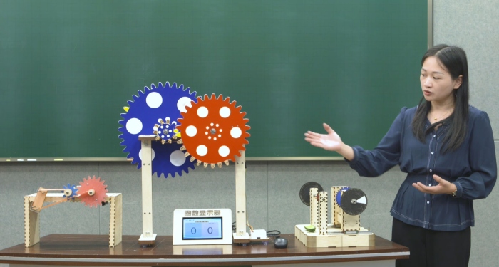 本次自制創(chuàng)新教具是基于粵教版小學(xué)六年級《傳動的齒輪》這一課制作的,分別有自制砂輪切割機(jī)模型、多功能齒輪傳動探究裝置、以及修正帶模型。借助自制的砂輪切割機(jī),直觀化了真實(shí)的砂輪切割機(jī)的工作原理,使學(xué)生能夠清晰看見齒輪傳動在生活中的應(yīng)用,以此來創(chuàng)設(shè)學(xué)習(xí)情境,很好的激發(fā)了學(xué)生學(xué)習(xí)的興趣;而在多功能齒輪傳動探究裝置中則創(chuàng)新性的在齒輪的齒上標(biāo)了數(shù)字,便于學(xué)生準(zhǔn)確地?cái)?shù)出兩齒輪轉(zhuǎn)動時(shí)各自轉(zhuǎn)過的齒數(shù),并且借助了樹莓派及霍爾傳感器,來準(zhǔn)確讀取兩齒輪各自轉(zhuǎn)過的圈數(shù),利用信息技術(shù)很好地解決了學(xué)生數(shù)圈數(shù)容易數(shù)錯(cuò)的情況,定性與定量相結(jié)合,直觀化了學(xué)生對齒輪傳動具有改變轉(zhuǎn)動方向以及轉(zhuǎn)動速度的特點(diǎn);而修正帶模型通過模擬放大直觀化了修正帶的工作過程,同時(shí)體現(xiàn)了齒輪傳動與帶傳動的應(yīng)用,為學(xué)生后續(xù)學(xué)習(xí)其他傳動方式做好鋪墊。最終新圩小學(xué)科學(xué)團(tuán)隊(duì)教師的作品憑借制作巧妙的創(chuàng)新教具以及精心設(shè)計(jì)的探究活動贏得了評委們的高度認(rèn)可。