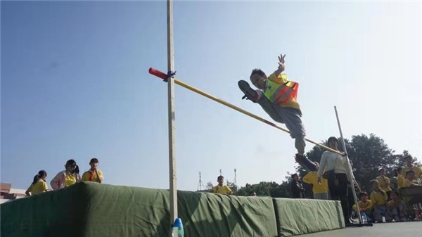 跳遠區(qū)域,是中高年級的專屬。裁判員的一個手勢,運動員隨即助跑、起跳、跨越、著墊,一連串的動作,贏得了啦啦隊員們的叫好聲,橫桿的升高,季軍、亞軍、冠軍也隨著誕生。