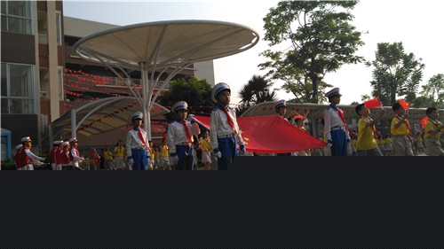 隊伍迅速排列好,身著禮服的鼓號隊奏起出旗曲,各中隊旗手行執(zhí)旗禮,國旗護(hù)衛(wèi)隊在全場師生的注目下莊嚴(yán)出場。