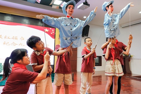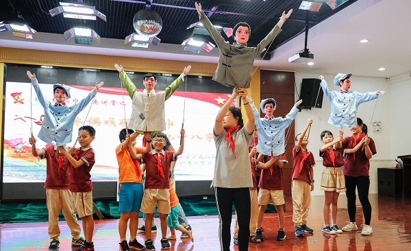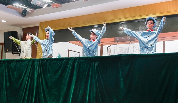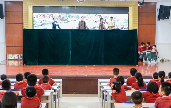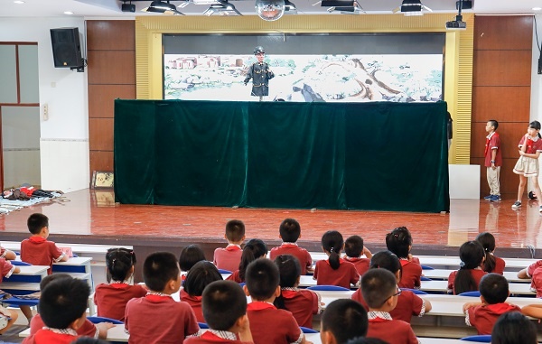 木偶戲演繹的是三鄉(xiāng)鎮(zhèn)抗日時(shí)期的一個(gè)事件《活捉飛天鴨》,工作人員通過(guò)木偶戲把隊(duì)員帶回了那段沉重的歷史中,讓學(xué)生們深刻意識(shí)到戰(zhàn)爭(zhēng)就發(fā)生在我們身邊。在觀看木偶戲的過(guò)程中,學(xué)生那炯炯有神的眼睛、那認(rèn)真聽(tīng)講的表情、那肩平身正的坐姿無(wú)一不說(shuō)明學(xué)生對(duì)這段歷史的重視。