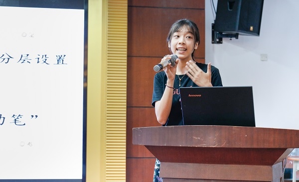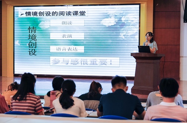 綜合營(yíng)的老師根據(jù)學(xué)科的特點(diǎn),暑假的研習(xí)內(nèi)容不僅有課例觀摩,還有專業(yè)技能訓(xùn)練和優(yōu)課打磨等內(nèi)容。許沂淼老師向我們展示了她大量速寫風(fēng)景畫的練習(xí)作品,她還以“這樣表現(xiàn):想改變什么?”為題,向我們分享了她在觀課過程中的收獲。劉凱麗老師和趙業(yè)帥老師都比較注重體育課堂的組織與教學(xué)方式的多樣化呈現(xiàn);張欣欣老師聲情并茂的展示了她在音樂教學(xué)上所獲得的新的技巧。李水鳳老師以“準(zhǔn)、扣、活、趣、多”為核心點(diǎn)闡述了她對(duì)英語(yǔ)課堂設(shè)計(jì)的新收獲;劉麗雁老師重點(diǎn)講解了英文繪本在教學(xué)設(shè)計(jì)中的運(yùn)用,她認(rèn)為繪本在詞匯教學(xué)、閱讀與寫作教學(xué)、語(yǔ)音教學(xué)等方面有很大的作用。