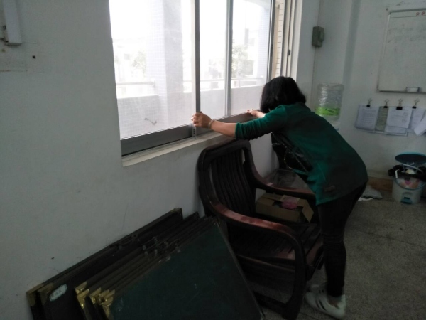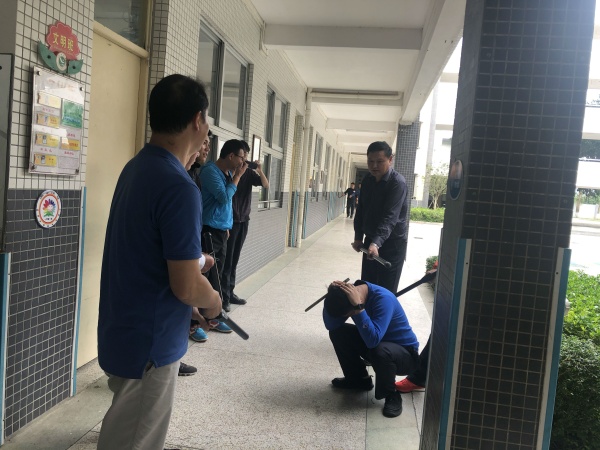 3月27日下午3點(diǎn),演練活動(dòng)正式開(kāi)始。一名“不法分子”以約見(jiàn)老師為理由要求進(jìn)校園。學(xué)校保安要求其出示身份證等有關(guān)證件進(jìn)行登記,然而這名“不法分子”趁保安不注意時(shí)強(qiáng)行闖入校園。一名保安立刻上前制止,另外一名保安迅速按下一鍵報(bào)警器。全校師生聽(tīng)到警報(bào)后立刻執(zhí)行“學(xué)校防暴應(yīng)急預(yù)案”。譚主任利用廣播告知師生“學(xué)校發(fā)生不法分子進(jìn)入校園”的通知。并且,學(xué)校護(hù)衛(wèi)隊(duì)16名隊(duì)員拿著警棍警戒,迅速分成4隊(duì),分別守住一樓4個(gè)樓梯口,防止不法分子沖入教學(xué)樓傷害學(xué)生。上課老師立即組織學(xué)生緊閉門窗,用課桌、木柜頂住門窗,防止不法分子破門窗而入。在室外上課的老師,指揮好學(xué)生緊急疏散到教室或安全地帶。