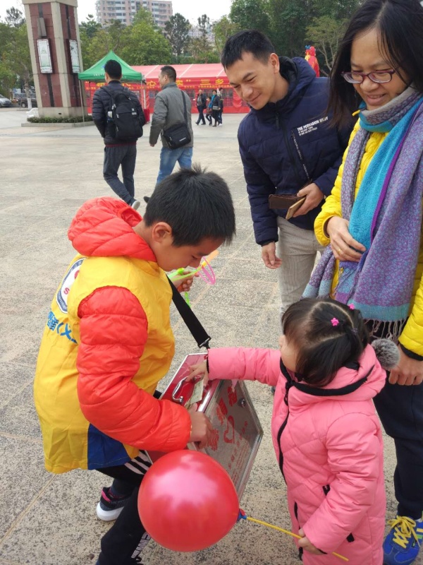 小義工們抓準機會,一看見有親子一起逛街的,迅速走到叔叔阿姨面前,游說家長們奉獻愛心,給孩子做一個好榜樣。小義工朋友們面帶微笑,帶著愛心,不斷地去分享,不斷地去傳播,影響著身邊每一位來美食節(jié)的家庭。