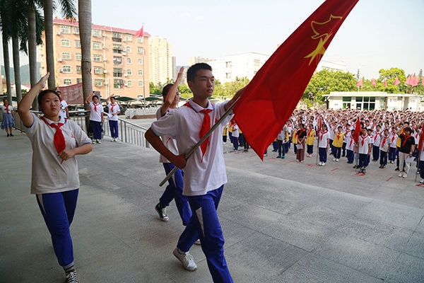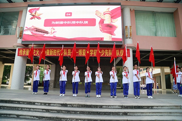 2019年9月26日,為引導(dǎo)隊(duì)員們繼承和弘揚(yáng)少先隊(duì)的光榮傳統(tǒng),增強(qiáng)少先隊(duì)員的光榮感和自豪感,培養(yǎng)少先隊(duì)員的民族自豪感和愛(ài)國(guó)、愛(ài)隊(duì)之情,展現(xiàn)新一代少先隊(duì)員的風(fēng)貌,激勵(lì)、教育全體少先隊(duì)員聽黨的話,愛(ài)祖國(guó),愛(ài)人民,愛(ài)學(xué)習(xí),做共產(chǎn)主義事業(yè)的接班人。博愛(ài)中學(xué)組織舉行了以“傳承星星之火 爭(zhēng)做新時(shí)代好隊(duì)員”為主題的初一少先隊(duì)建隊(duì)儀式。