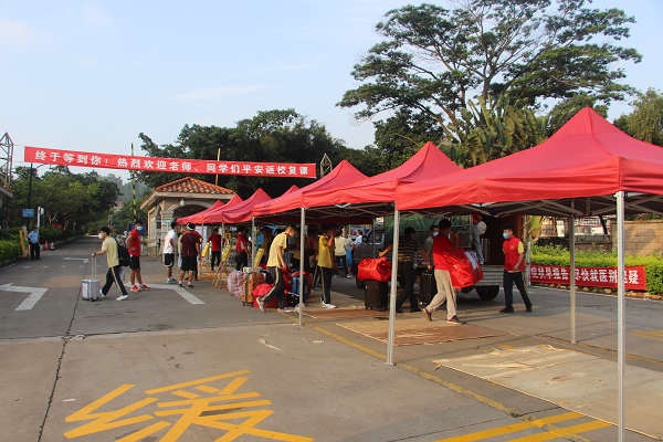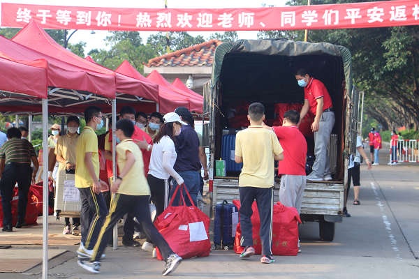 第二批返校復(fù)課學(xué)生三千余人,全部按計劃分批錯峰返校。初中兩個年級分上下午在學(xué)校正門、西門、側(cè)門、后門四個入口分班錯峰返校。每一個班級學(xué)生所對應(yīng)的返校通道、返校時間段及其他各項要求已提前通過給家長發(fā)布的《告家長書》逐一傳達(dá)到每一位學(xué)生及其家長,真正做到錯峰、分時、分散返校。為了讓家長無后顧之憂,將學(xué)生送到校門口立刻安心離校,學(xué)校還組織了部分管理人員、初中教師、生活老師、后勤人員以及部分學(xué)生作為志愿者,在各個入口幫助返校學(xué)生卸行李、搬行李,引導(dǎo)學(xué)生檢測體溫等,完成好學(xué)生平安復(fù)課的每一道安全關(guān)卡。