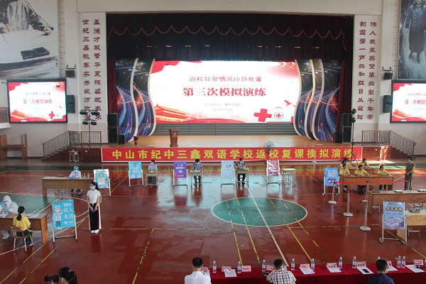 伴隨著夏風(fēng)習(xí)習(xí),這個(gè)超長寒假終于慢慢走向了終點(diǎn)。繼首批初三、高三學(xué)生返校復(fù)課之后,5月11日,初一和初二年級的同學(xué)們也將迎來復(fù)課,回到他們心心念念的教室開始正常的學(xué)習(xí)生活。為進(jìn)一步提高三鑫師生疫情防控意識和疫情應(yīng)急處置能力,嚴(yán)防疫情輸入校園,確保返校復(fù)課后良好的教育教學(xué)秩序,維護(hù)師生健康和安全。5月6日下午,紀(jì)中三鑫雙語學(xué)校初一、初二年級聯(lián)合生活部一起在學(xué)校體育館舉行了“第二、三批學(xué)生返校復(fù)課異常情況應(yīng)急處置演練”。 此次演練主要模擬的情景是“就餐中發(fā)現(xiàn)某學(xué)生咳嗽并檢測到發(fā)熱的應(yīng)急處置”。