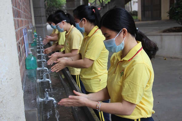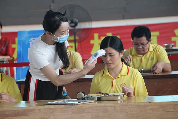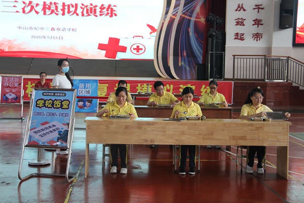 演練從餐前學(xué)生(學(xué)生由生活部老師扮演)排隊(duì)洗手、進(jìn)入餐廳開始。學(xué)生在進(jìn)入飯?zhí)们坝行蚺抨?duì)用“七步洗手法”洗手,然后進(jìn)入餐廳隔位而坐,摘下口罩開始進(jìn)餐。進(jìn)餐過程中有學(xué)生咳嗽難受,生活老師發(fā)現(xiàn)后為該生體溫檢測為37.6℃,立即提醒周邊同學(xué)們佩戴口罩,并通知樓長帶領(lǐng)周邊同學(xué)到備用區(qū)重新配餐、就餐。生活老師報(bào)告醫(yī)務(wù)室以及生活部主管,帶領(lǐng)該生前往留觀室做詳細(xì)檢查。醫(yī)生為該生做更進(jìn)一步檢查和相關(guān)詢問后,將異常情況匯報(bào)給沈偉忠校長以及該生的生活老師、班主任。沈偉忠校長收到反饋信息后,向上級教育部門匯報(bào)。校醫(yī)室立即向鎮(zhèn)疾控中心報(bào)告,班主任立即向家長通報(bào)情況,校醫(yī)通知總務(wù)處安排人員對餐廳進(jìn)行消毒。最后,疾控部門到場處理,接學(xué)生到醫(yī)院就診。沈校長馬上召集相關(guān)部門的管理人員會議,啟動緊急應(yīng)急處置預(yù)案。