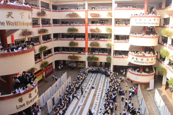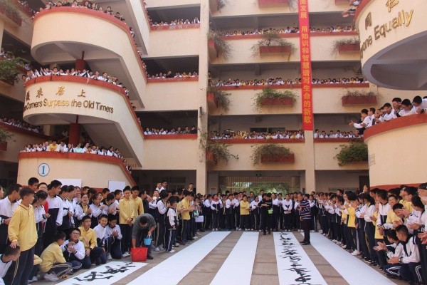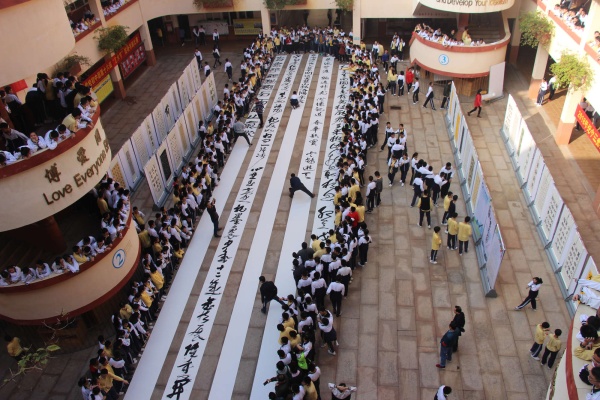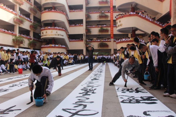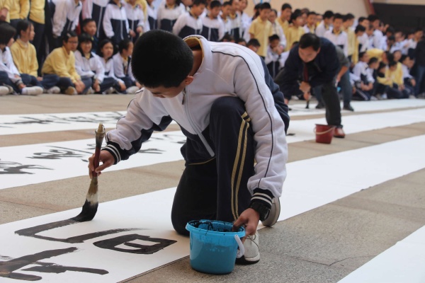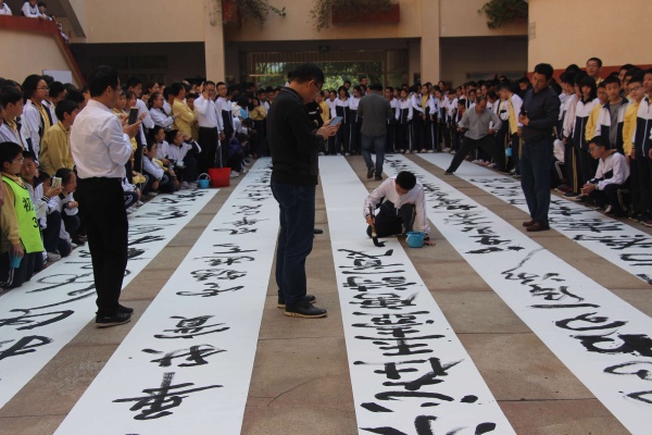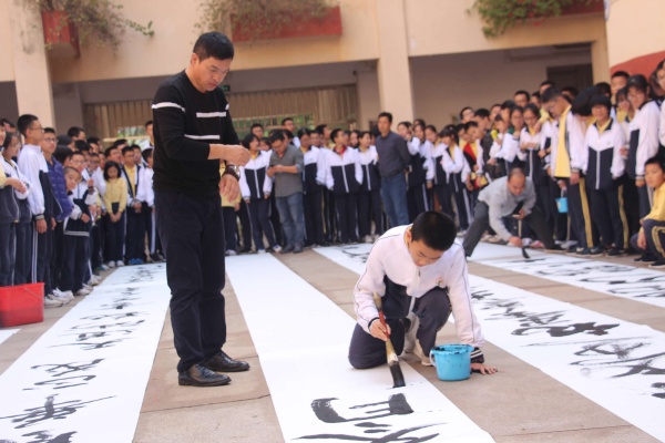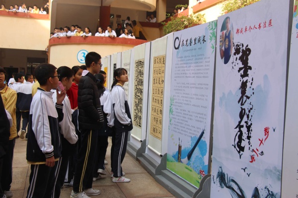 他今年12歲,學(xué)書6年,此次展出毛筆、硬筆作品近百幅,兼具篆書、隸書、楷書、草書、行書眾體等。展出現(xiàn)場(chǎng),中國書法家協(xié)會(huì)會(huì)員、三鑫書法中心主任單永輝與三鑫蔣疑明、朱曉杰等書法教師鼎力相助,與鄭成卓一起,師生現(xiàn)場(chǎng)揮毫潑墨。初中部教學(xué)樓五個(gè)樓層,三千多師生圍觀,場(chǎng)面震撼,掌聲、呼喊聲不斷!