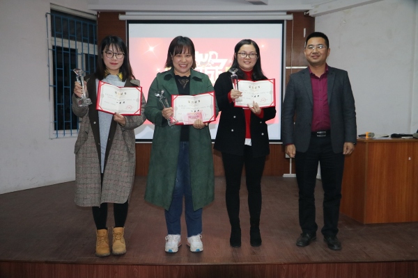 緊接著是精彩的頒獎(jiǎng)時(shí)刻。在首屆“東華杯”教學(xué)大賽的舞臺(tái)上,蔣飛燕老師、曾思佳老師、歐曉麗老師、楊磊老師、寧龍鋒老師和莫晶晶老師在自己的課堂教學(xué)中滿懷激情、富有創(chuàng)新意識(shí),表現(xiàn)優(yōu)秀,獲得優(yōu)秀獎(jiǎng);趙小華老師、江彩絲老師、梁彩容老師、謝秀霞老師、李晶晶老師和何翠陽(yáng)老師經(jīng)驗(yàn)豐富、業(yè)務(wù)精良,教學(xué)做到講練無(wú)縫對(duì)接,表現(xiàn)突出,榮獲三等獎(jiǎng);徐群老師、黃曉玲老師、陳垵鈉老師和劉海英老師學(xué)科素深厚,課堂另辟路徑,創(chuàng)設(shè)情境,深情演繹,表現(xiàn)精彩,喜獲二等獎(jiǎng);陳麗冬老師、陳嘉欣老師和張靜老師的課堂則理念新、設(shè)計(jì)巧、師生互動(dòng)默契、課堂教學(xué)目標(biāo)達(dá)成度高、教學(xué)特色彰顯,教師魅力綻放如畫,堪稱表現(xiàn)完美,摘得一等獎(jiǎng)。英語(yǔ)科組在這次教學(xué)大賽中,不管是從賽前團(tuán)隊(duì)協(xié)作,還是參賽教師的得分,表現(xiàn)均比較突出,被評(píng)為“優(yōu)秀科組”。徐文校長(zhǎng)等領(lǐng)導(dǎo)為以上獲獎(jiǎng)老師、團(tuán)體頒發(fā)了證書(shū)并合影留念。