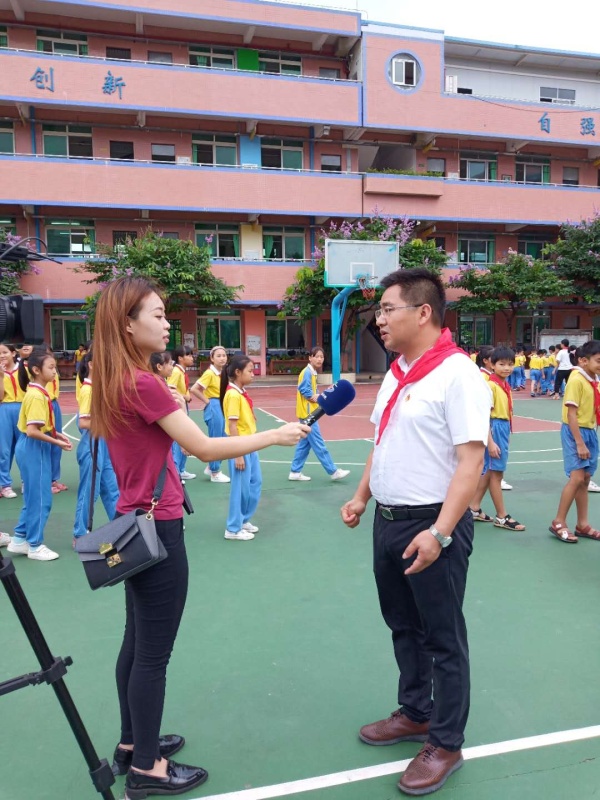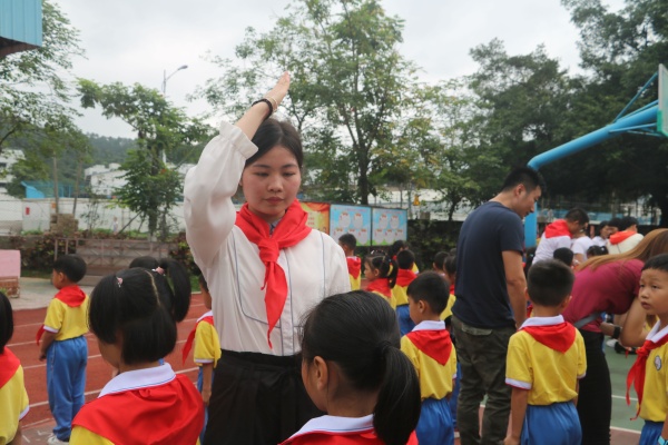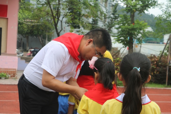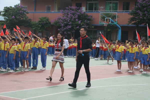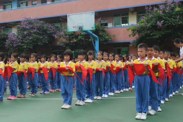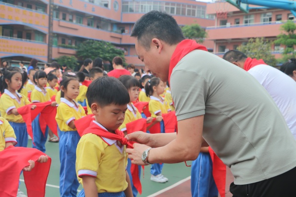 接著,大隊(duì)輔導(dǎo)員梁文婷老師宣讀了新隊(duì)員入隊(duì)名單,并對(duì)新隊(duì)員入隊(duì)表示熱烈祝賀。徐文校長(zhǎng)、德育處熊鈞俊、陳大彪主任、教導(dǎo)處徐群、王輝主任、辦公室陳媛媛主任等行政人員,和一年級(jí)科任老師、光臨會(huì)場(chǎng)觀禮的部分家長(zhǎng)以及高年級(jí)的老隊(duì)員一起為一年級(jí)的新隊(duì)員佩戴上紅領(lǐng)巾。然后,在大隊(duì)長(zhǎng)歐佳希同學(xué)的帶領(lǐng)下,隊(duì)員們進(jìn)行了莊嚴(yán)的宣誓。