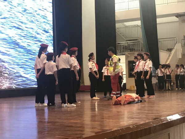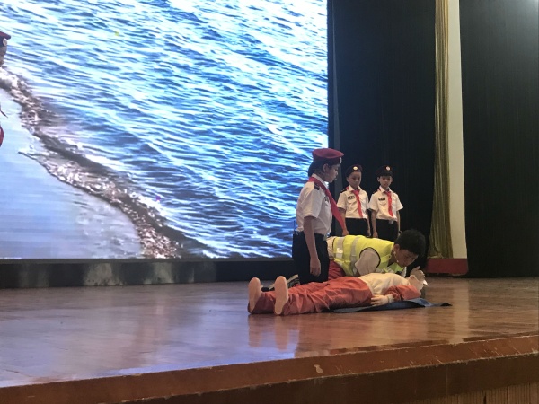 光后醫(yī)療輔助隊(duì)與校外輔導(dǎo)員馮子杰老師,為大家獻(xiàn)上了一場(chǎng)極具教育意義的情景劇《海灘急救》。配合背景視頻、故事講述,以及輔助隊(duì)隊(duì)員們的協(xié)作,展現(xiàn)出光后醫(yī)療輔助隊(duì)的專(zhuān)業(yè)精神與認(rèn)真態(tài)度。