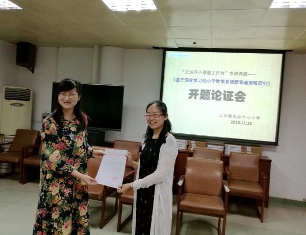 2018年11月13日下午,三鄉(xiāng)鎮(zhèn)光后中心小學“王運芹小課題工作坊”市級課題《基于深度學習的小學生易錯題管理策略研究》開題報告會在光后中心小學會議室舉行,全程由曾彩虹老師主持。中山市教研室教研員林曉潔老師、三鄉(xiāng)鎮(zhèn)教育事務指導中心潘光利主任、原三鄉(xiāng)鎮(zhèn)教育黨總支周少鶴書記與大布小學曾鵬主任四位課題評議專家蒞臨指導,光后中心小學龍朝暉校長,熊昌河、張婕妤、李俊玲三位教導處主任以及全體數(shù)學老師參與了此次會議。