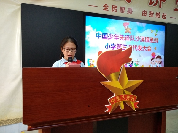 大會在激昂的國歌聲中拉開序幕。首先是五(2)中隊王璽覃隊員、劉韶萱隊員代表向大會獻詞,精彩激昂的獻詞激勵著每一位少先隊員“為共產(chǎn)主義事業(yè)而奮斗”的決心,號召大家用知識做鎧甲,用信念搭建理想之橋,做一個有理想、有道德、有文化的社會主義接班人。隨即是圣獅小學(xué)少工委副主任李春蘭主任向大會致辭,李主任對大會的勝利召開表示熱烈祝賀,同時也表達了對少先隊員成長的期盼和祝福。