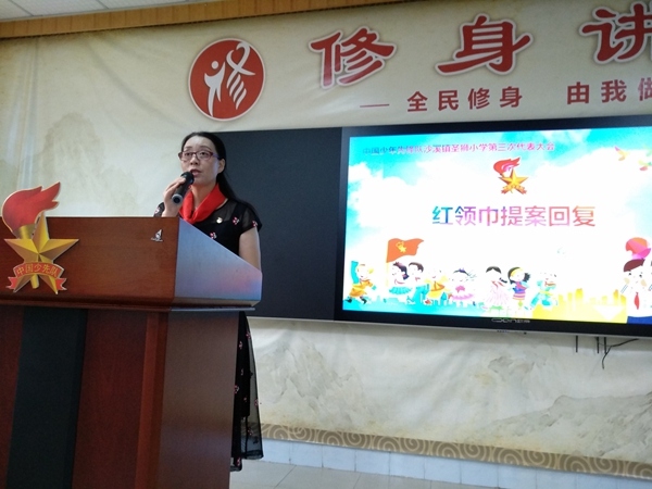 接著,大會審議通過了新一屆大隊委名單,并為新一屆大隊委授臂章。與此同時,黃慧芳校長在大會上對全校收集的代表性議案進行現(xiàn)場回復(fù)。
