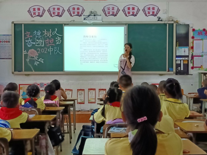 “老師我感謝您,您像一把金鑰匙,把無知的我們領(lǐng)進(jìn)知識(shí)的寶庫?!薄澳侨鐕?yán)父般的教誨和慈母般的關(guān)愛,時(shí)刻溫暖著我們。” “教師是火種,點(diǎn)燃了學(xué)生的心靈之火;教師是石級(jí),承受著學(xué)生一步步踏實(shí)地向上攀登?!薄且痪渚涓腥朔胃恼Z言更是讓老師們刻骨銘心。9月9日?qǐng)F(tuán)隊(duì)會(huì)課上舉行“立德樹人,奮進(jìn)擔(dān)當(dāng)”做有情懷的教師主題隊(duì)會(huì)。同學(xué)們積極發(fā)言,說出自己心中最“美”的老師;熱烈討論:如果自己以后成為老師,要怎樣做一名奮進(jìn)擔(dān)當(dāng)?shù)暮美蠋煛W詈?,?dāng)學(xué)生把賀卡和征文送給老師,當(dāng)學(xué)生在教室進(jìn)行《每當(dāng)我走過老師窗前》大合唱的時(shí)候,老師情不自禁流下了幸福的熱淚。