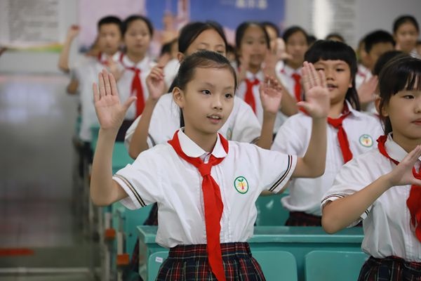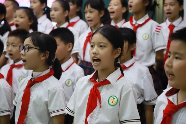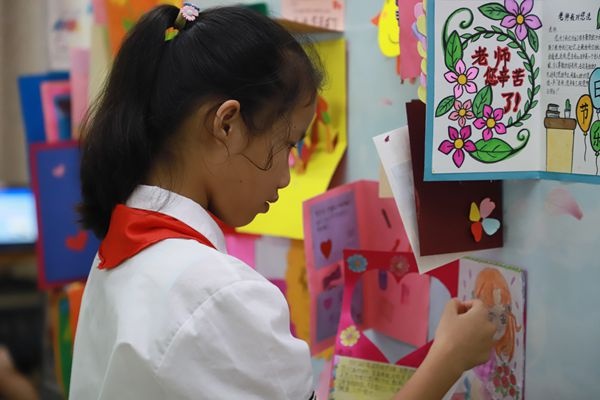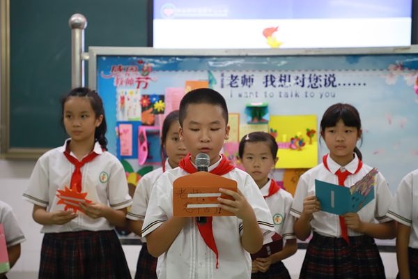 下午3點,大隊委委員宣布活動開始,出隊旗,敬隊禮,活動在莊嚴(yán)肅穆的氛圍中拉開了序幕。首先是四(3)班中隊李卓軒、劉若妍為教師節(jié)獻詞,他們聲情并茂地朗誦了一首詩歌,感染了在場的師生們。接著是心意卡展示,各班代表手執(zhí)自制精美的心意卡在臺前傾訴對老師的熱愛和祝福,然后將其掛在心意墻上。緊接著,校合唱隊演唱了一首世界名曲《可愛的家》,將校園比作大家庭,唱出了對老師的感恩和愛戴。歌聲悠揚動聽,贏得了同學(xué)們熱烈的掌聲。合唱結(jié)束后,全體教師上臺宣誓,重溫教師誓言,不忘初心,牢記使命,做“四有”好老師,做好學(xué)生引路人。宣誓完畢,孩子們?yōu)槔蠋煫I上鮮花,并表演手語歌《聽我說,謝謝你》,孩子們的眼里充滿深情,動作整齊劃一,童聲真摯悅耳,現(xiàn)場氣氛溫馨感人。最后,少先隊輔導(dǎo)員伍煜獻老師帶領(lǐng)隊員們呼號:“準(zhǔn)備著:為共產(chǎn)主義事業(yè)而奮斗!”全體少先隊員齊聲回應(yīng): “ 時刻準(zhǔn)備著!”活動在孩子們激昂的呼號聲中落下帷幕,取得了圓滿的成功。