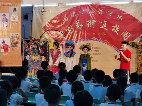 活動開始,由主持人尤海波講述粵劇歷史,介紹粵劇行當?;泟⌒挟敺譃椋荷⒌?、末、丑、外、小、貼、夫、雜十大行當,后來演變?yōu)椤傲啤保何奈渖⑿∩?、正印花旦、二幫花旦、丑生、武生。通過講述粵劇歷史,從中啟發(fā)同學(xué)們對戲曲藝術(shù)的基本認識,讓更多青少年了解粵劇、熱愛傳統(tǒng)戲曲文化。