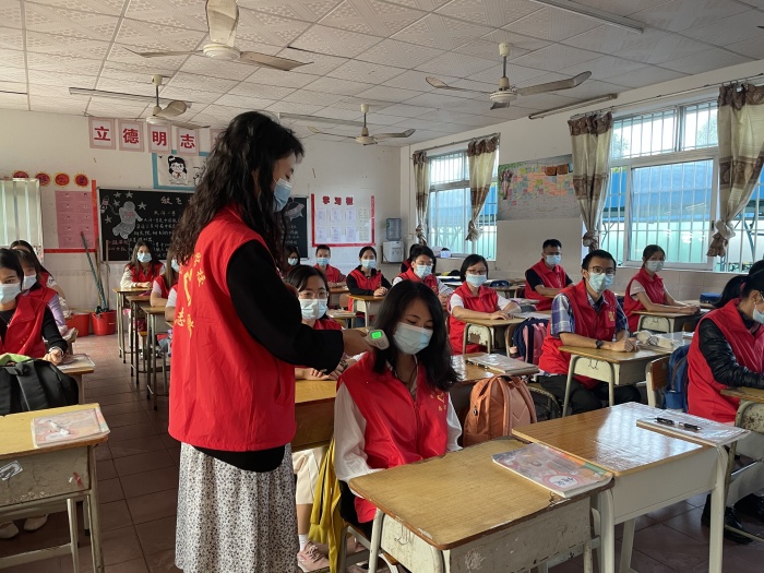 17日早上,學校開展防控模擬演練,模擬師生在上課期間有癥狀異常情況的處置流程。當堂教師在例行晨檢中,發(fā)現(xiàn)有“學生”發(fā)熱現(xiàn)象,老師立即讓該生佩戴好口罩,并引導其出班級,與其他學生保持距離,立即打電話,讓“保健老師”來復檢,保健老師將其帶到觀察室,初步判斷為疑似病例,立即上報學校防控負責人,再逐級上報到“鎮(zhèn)教育主管部門和疫情防控部門”。