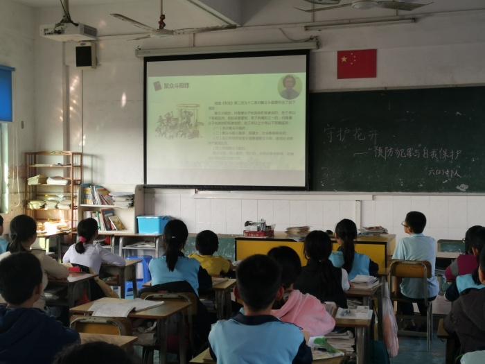 班會(huì)課上,各班首先觀看了中山市人民檢察院制作的《未成年人人身傷害的罪與罰》視頻,視頻從未成年人最容易觸犯的聚眾斗毆傷害罪、尋釁滋事罪、故意傷害罪、故意殺人罪等涉及人身傷害的犯罪進(jìn)行介紹,并結(jié)合未成年人的年齡特點(diǎn)引入具體案例進(jìn)行詳細(xì)分析,指出哪些不良行為與習(xí)慣容易誘發(fā)犯罪,哪些事件容易引起犯罪,哪些事該做,哪些事不可以做,引導(dǎo)同學(xué)們?cè)趯W(xué)習(xí)生活中該怎樣避免違法犯罪,有效保護(hù)自己,并提出可行性建議,要求同學(xué)們要學(xué)法、懂法,以法約束自己的行為,同時(shí)要有一定的安全意識(shí),遇到不法侵害時(shí),要依靠智慧,敢于維權(quán)。視頻內(nèi)容淺顯易懂,具有很強(qiáng)的針對(duì)性和實(shí)用性,同學(xué)們邊聽(tīng)邊學(xué),興趣濃厚。最后,班主任老師組織同學(xué)們根據(jù)視頻內(nèi)容展開(kāi)討論,大家紛紛發(fā)言,一致認(rèn)為通過(guò)學(xué)習(xí),不僅懂得了青少年違法犯罪的一些主要原因,更清楚在生活學(xué)習(xí)中要如何去與人相處,同學(xué)之間應(yīng)相互關(guān)心、相互尊重,不要主動(dòng)與人發(fā)生沖突,要學(xué)會(huì)寬容、理解,關(guān)心友愛(ài)、互諒互讓?zhuān)挥醚哉Z(yǔ)侮辱別人,不要有欺凌行為,不與社會(huì)不良青年交往,不參與學(xué)生打架、斗毆,學(xué)會(huì)正確處理矛盾糾紛。