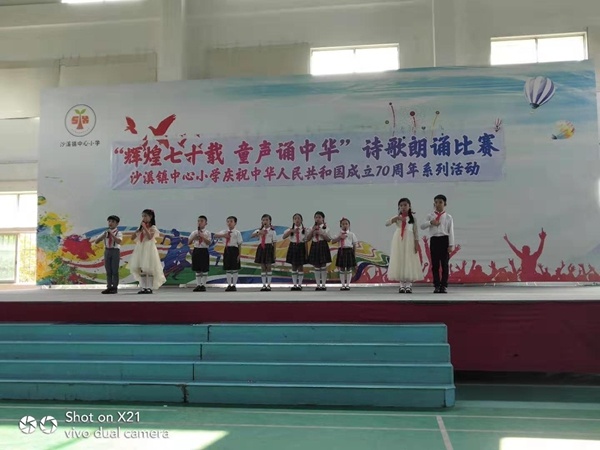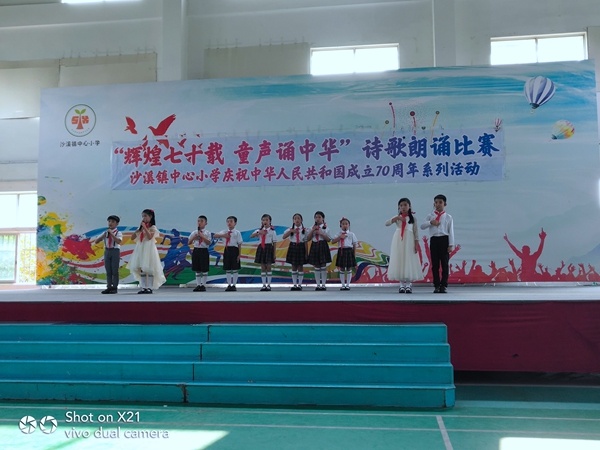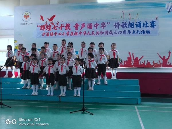 為了慶祝新中國(guó)70歲華誕,謳歌新中國(guó)所取得的偉大成就,陶冶學(xué)生的藝術(shù)情操,提高學(xué)生詩(shī)歌朗誦水平及語(yǔ)文素養(yǎng),營(yíng)造朝氣蓬勃、積極向上的校園文化氛圍。9月29日下午,沙溪鎮(zhèn)中心小學(xué)一至三年級(jí)的全體師生在學(xué)校禮堂舉行了以“輝煌七十載,童聲誦中華”為主題的詩(shī)歌朗誦比賽。