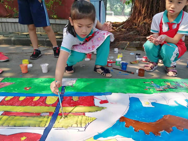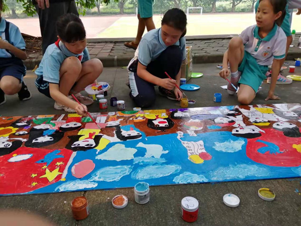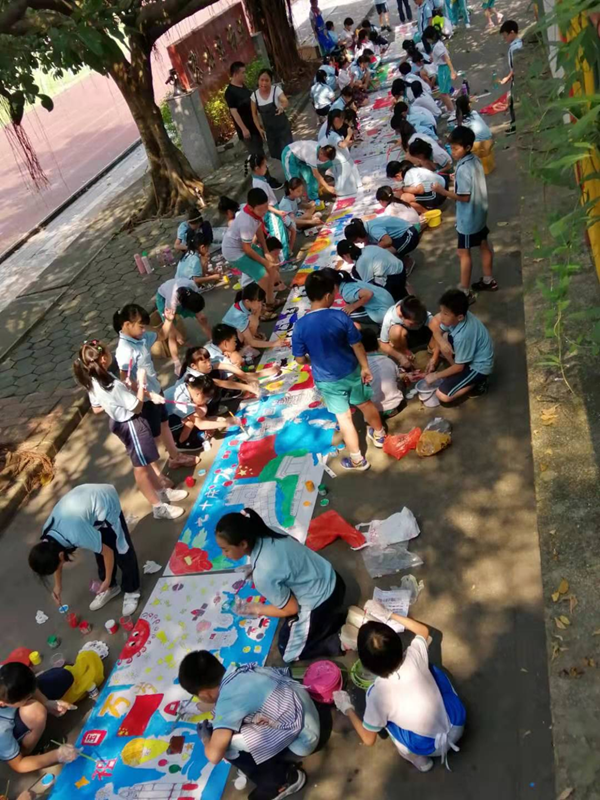 此次活動(dòng)由三至六年級(jí)各班選派10名學(xué)生作為參賽代表,17個(gè)班共一百多人參加繪畫。每個(gè)班在長(zhǎng)度90*200厘米的的畫卷上繪畫,時(shí)間為90分鐘。在大隊(duì)輔導(dǎo)員伍煜獻(xiàn)老師一聲令下,百人繪畫比賽在沙溪鎮(zhèn)中心小學(xué)黎燦運(yùn)動(dòng)場(chǎng)正式開始。只見各班的參賽選手各司其職,分工明細(xì),有的負(fù)責(zé)勾畫出作品的整體輪廓,有的負(fù)責(zé)調(diào)色與上色,有的負(fù)責(zé)書寫標(biāo)題,現(xiàn)場(chǎng)氣氛熱鬧、緊張而有序。伴隨著時(shí)間的推移,各班的畫作逐漸清晰起來,天安門、長(zhǎng)城、生日蛋糕、可愛的小朋友們的形象……慢慢的在畫布上呈現(xiàn)出來,孩子們以自己靈巧的雙手勾畫出對(duì)新中國(guó)70華誕的贊美與祝福,創(chuàng)作出了一幅幅色彩鮮艷,創(chuàng)意十足的作品,他們用色彩鮮明的畫作表達(dá)了對(duì)祖國(guó)的熱愛和祝福。
