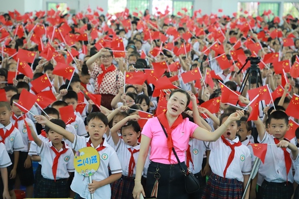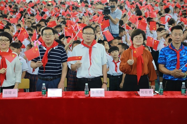 活動(dòng)的最后,進(jìn)行了由大隊(duì)委方梓妍和彭本懿同學(xué)領(lǐng)唱的聲勢(shì)浩大的千人合唱《我和我的祖國(guó)》,沒(méi)有耀眼的明星,沒(méi)有華麗的舞臺(tái),全體與會(huì)人員揮舞著五星紅旗,用最真摯的熱情,最燦爛的笑容,最優(yōu)美的歌聲,共同祝愿我們偉大的祖國(guó)越來(lái)越強(qiáng)大,為新中國(guó)70華誕,獻(xiàn)上最美好的祝福!歌聲飛揚(yáng),紅旗舞動(dòng)……整個(gè)會(huì)場(chǎng)成了歌唱的天地、歡樂(lè)的海洋。