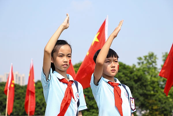 隨后,少先隊員何元斌一首蕩氣回腸的《國家》將師生們的愛國熱情推向高潮。濠涌小學(xué)的全體師生舞動紅旗,齊唱《歌唱祖國》和《我和我的祖國》。在嘹亮的歌聲中,愛心造型中央穩(wěn)穩(wěn)托起一面鮮艷的五星紅旗。全體師生共同呼號:祖國萬歲!祖國萬歲!