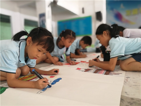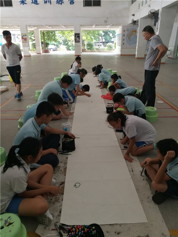 活動在康樂小學禮堂進行,雖然條件簡陋,卻不會影響學生的放飛的熱情?;顒訃@“中國夢”為主要內(nèi)容,自由選擇素材與工具,自主組成小組。隨著美術教師何春花老師的示范拉開序幕,打開學生對自己夢的想象?;顒又袑W生們有的手執(zhí)馬克筆畫線描畫長卷,有的學生畫國畫,他們充分發(fā)揮自己的想象力,揮舞手中的畫筆在生宣紙上大膽地作畫,那種自信可謂是史無前例。一條條柔和流暢的線條、一抹抹鮮明活潑的色彩,構成了一幅幅絢爛動人的畫作。用屬于他們天真活潑的個性和純真美好的心靈描繪自己心中的夢想。
