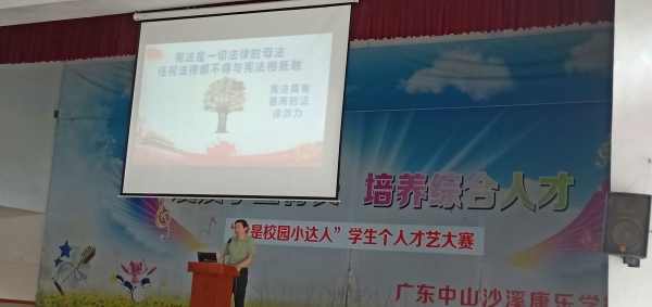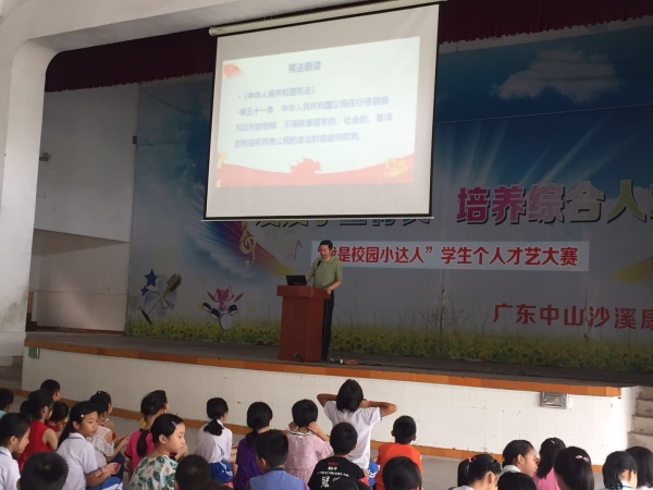 為貫徹落實上級關(guān)于憲法學(xué)習(xí)宣傳教育的指示,弘揚憲法精神,培養(yǎng)學(xué)生學(xué)法、知法、守法、護法的意識和行為,營造校園法治宣傳氛圍。5月31日上午,沙溪鎮(zhèn)康樂小學(xué)邀請了廣中律師事務(wù)所張愛文律師為四、五、六年級學(xué)生開展了一場以“憲法在我心中”為主題的憲法教育大講堂講座活動。本次講座在康樂小學(xué)大禮堂舉行,康樂小學(xué)吳偉標校長、政教處沈光元主任、四五六年級各班班主任及學(xué)生近500人聆聽了本次講座。