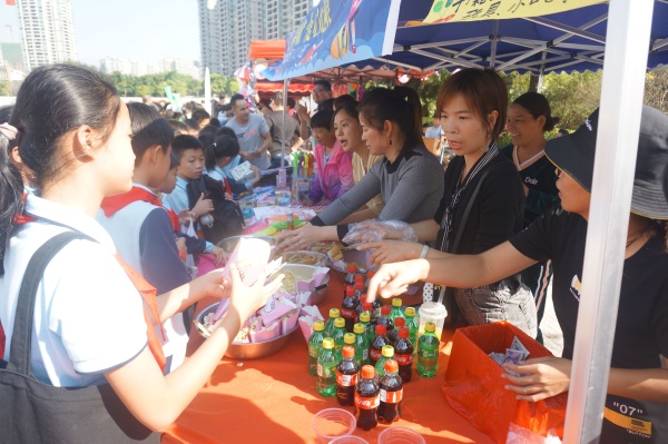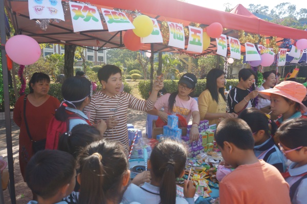 當(dāng)天下午,義工家長們早早來到學(xué)校布置攤位,每個“商鋪”的海報設(shè)計都別具特色。兩點十分,義賣活動正式開始,同學(xué)們有序進(jìn)場,校園恍如“集市”一下子熱鬧起來,人聲鼎沸。各班義賣物品琳瑯滿目:漂亮的學(xué)習(xí)用具、新奇有趣的玩具、讓人垂涎欲滴的美味小吃、種類繁多的飲料還有同學(xué)們捐獻(xiàn)的閑置書籍等等。除了商品的多樣性外,經(jīng)營方式更是精彩紛呈,創(chuàng)意無限。有的通過展示才藝的來吸引顧客眼球,還有的穿著恐龍服裝來招攬“顧客”,有的變身成一名小小推銷員,抱著義賣物品四處奔走、叫賣,更有的孩子固守攤位,分工合作,有的叫賣、有的理貨、有的收錢,忙得不亦樂乎。義工家長們各出奇招,賣力地推銷,還有不少熱心的家長也加入到義賣的隊伍中。孩子們邊逛邊玩,丟圈圈,撈小魚,吹乒乓球,砸金蛋等等,玩得不亦樂乎。一時間,歡笑聲,叫賣聲,討價還價聲,場面熱鬧非凡,匯成一片歡樂的海洋。