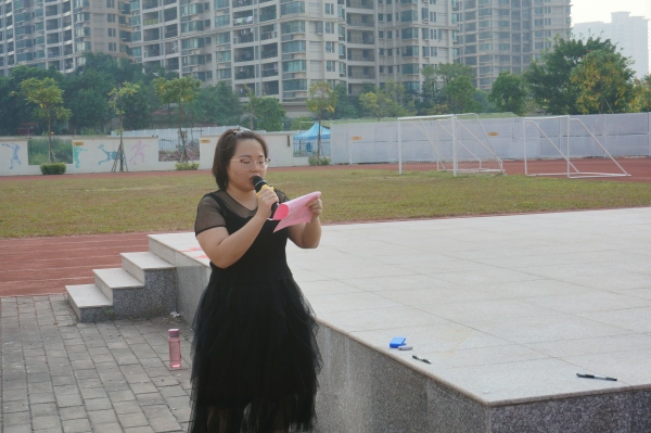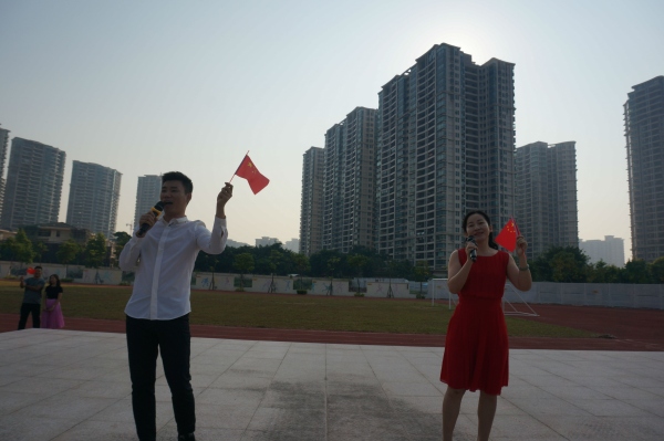 八點(diǎn)十分,禮贊國(guó)慶活動(dòng)正式開(kāi)始。隨著悠揚(yáng)而熟悉的《我和我的祖國(guó)》旋律響起,劉孜老師和施燕紅老師揮舞這小紅旗,走上臺(tái),帶領(lǐng)全體師生一起跟著音樂(lè)唱起來(lái),“我和我的祖國(guó),一刻也不能分割,無(wú)論我走到哪里,都流出一首贊歌……”這動(dòng)人的旋律激起了師生們心中的愛(ài)國(guó)之情,全體師生有節(jié)奏地?fù)]舞著那一面神圣的小國(guó)旗,高聲唱著那催人奮進(jìn)的祖國(guó)贊歌,將活動(dòng)推向了高潮。愛(ài)國(guó)之音響徹在校園內(nèi),回蕩在每一位老師和學(xué)生的心里,大家用歌聲盡情抒發(fā)對(duì)黨和祖國(guó)的熱愛(ài),為黨和祖國(guó)獻(xiàn)上最真切的祝福。