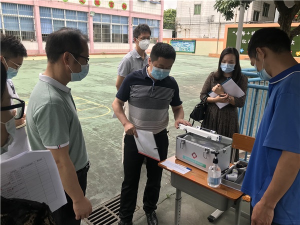 檢查組一行聽取了吳發(fā)志校長關(guān)于疫情防控和復(fù)學(xué)準(zhǔn)備工作的匯報,詳細(xì)查看了相關(guān)資料,實地查看了校園體溫檢測點(diǎn)、防控物質(zhì)儲備室、防控隔離室、衛(wèi)生防疫消毒、辦公教學(xué)等區(qū)域,并詳情了解學(xué)校師生健康體質(zhì)監(jiān)測、防疫物資準(zhǔn)備、學(xué)生晨午檢、分餐安排、防控應(yīng)急預(yù)案等工作落實情況。另外,檢查組一行在學(xué)校會議室詳細(xì)了解了學(xué)校各項防疫工作流程和預(yù)案,查閱了相關(guān)復(fù)學(xué)準(zhǔn)備工作臺賬資料。