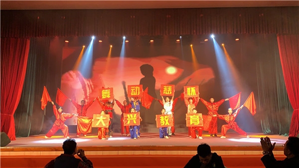 12月8日晚上,龍頭環(huán)學(xué)校用學(xué)校特色教學(xué)項(xiàng)目為載體創(chuàng)作的武術(shù)表演:《舞動(dòng)慈懷 大興教育》在鎮(zhèn)政府禮堂傾情上演。武術(shù)社團(tuán)的學(xué)生們功架十足,自如地?fù)]舞手上的旗幟,剛勁有力的持握著刀槍劍棍,舞臺(tái)上呈現(xiàn)出一片紅火氣氛,盡顯朝氣蓬勃,最后展示出“舞動(dòng)慈懷,大興教育”的字樣,讓人頗感溫暖。