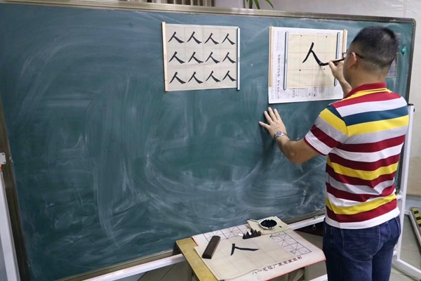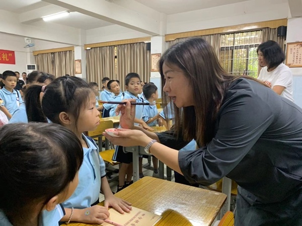 圣獅小學(xué)黃校長致辭后,開筆禮正式開始。孩子們在主持人話語的引導(dǎo)下,孩子們正衣冠、朱砂啟智、擊鼓鳴志、描紅“人”字、齊誦弟子規(guī)和孝親敬師。在自正衣冠環(huán)節(jié)中,孩子們知道了著裝要整潔。通過朱砂啟智環(huán)節(jié),孩子們得到了領(lǐng)導(dǎo)、老師和家長的祝福,通過點“痣”,開啟智慧,從此眼明心亮,好讀書,讀好書,讀書好。擊鼓鳴志環(huán)節(jié)中,黃校長擊的三聲鼓聲,聲音響且傳得遠,寓意著孩子們志向遠大。第四環(huán)節(jié)是啟蒙描紅,黃解球老師分別用粉筆和毛筆示范書寫“人”字。孩子在開筆禮現(xiàn)場寫“人”字,寓意著在人生的啟蒙階段,要學(xué)會做人。隨后,一年級新生在丁老師的帶領(lǐng)下,齊誦弟子規(guī)的節(jié)選部分。最后,為傳承“孝、禮”好家風(fēng),發(fā)揮圣獅小學(xué)校園文化核心“傳承好家風(fēng)”的傳統(tǒng),孩子們在主持人的引導(dǎo)下,向老師和父母行鞠躬禮,表示感恩。