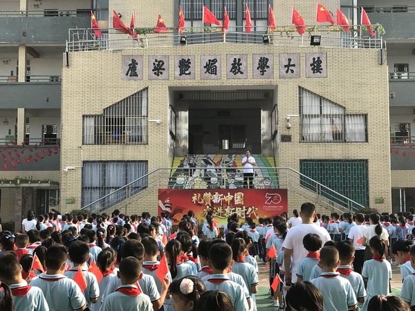 上午8時,在全體師生的注視下,在雄壯的國歌聲中,鮮艷的五星紅旗迎著東方的朝陽冉冉升起。全體師生用嘹亮和激昂的國歌聲,表達對新中國70華誕的深情祝福。隨后,張明文校長作國旗下講話,他勉勵同學們要好好學習,天天向上,從小做起,從小事做起,努力學習知識、掌握本領,長大后成為祖國的棟梁之才,為祖國的繁榮復興添磚加瓦。接著,全體師生手揮小國旗,齊唱《歌唱祖國》、《我和我祖國》,大家用響亮的歌聲禮贊親愛的祖國,用深情由衷地表白奮進的新時代。全場高呼“祖國萬歲”,希望我們親愛的祖國生生不息,繁榮昌盛,永葆青春活力。