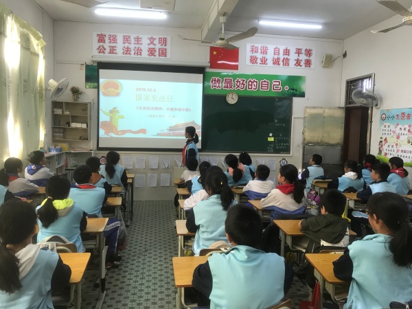 首先,由一(2)班黃楠同學(xué)作《弘揚(yáng)憲法精神,共建和諧中國(guó)》國(guó)旗下講話(huà),隨后該校校長(zhǎng)楊振環(huán)倡議全體師生行動(dòng)起來(lái),積極學(xué)習(xí)憲法知識(shí)。楊校長(zhǎng)強(qiáng)調(diào)憲法是國(guó)家的根本大法,是治國(guó)安邦的總章程,將憲法實(shí)施日定為憲法日,意義十分重大。他希望同每個(gè)同學(xué)守法從遵守班規(guī)、校規(guī)做起,做到懂法、知法、守法,做遵紀(jì)守法的好公民,以正確的法制觀念去影響身邊的人,帶動(dòng)周?chē)娜耍餐瑺I(yíng)造崇尚法治的社會(huì)氛圍。隨后各班利用班隊(duì)課開(kāi)展了小學(xué)生憲法知識(shí)競(jìng)賽活動(dòng),進(jìn)一步豐富學(xué)生的憲法知識(shí),加深對(duì)憲法的理解。