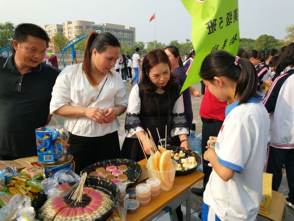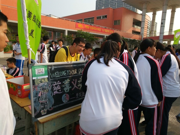 在26日下午的義賣現(xiàn)場,全校2000多名師生和眾多熱心家長一起齊聚學(xué)校廣場,按照規(guī)劃好的場地擺好攤位?;顒訒r間一到,同學(xué)們和家長義工一起,紛紛將之前籌集到的師生制作的手工藝品、體現(xiàn)正能量、中華優(yōu)秀傳統(tǒng)文化的書法字畫、書籍、玩具、爸爸媽媽親手制作的美食等擺上臺面。琳瑯滿目的商品、此起彼伏的叫賣聲、各種精心設(shè)計的廣告牌讓校園頓時化身賣場,同學(xué)和家長義工們有的在積極地叫賣,有的在精心挑選物品,每個攤位前都圍得水泄不通,愛心化作暖流,讓走過30年的12.8慈善籌款活動顯得更加有聲有色。