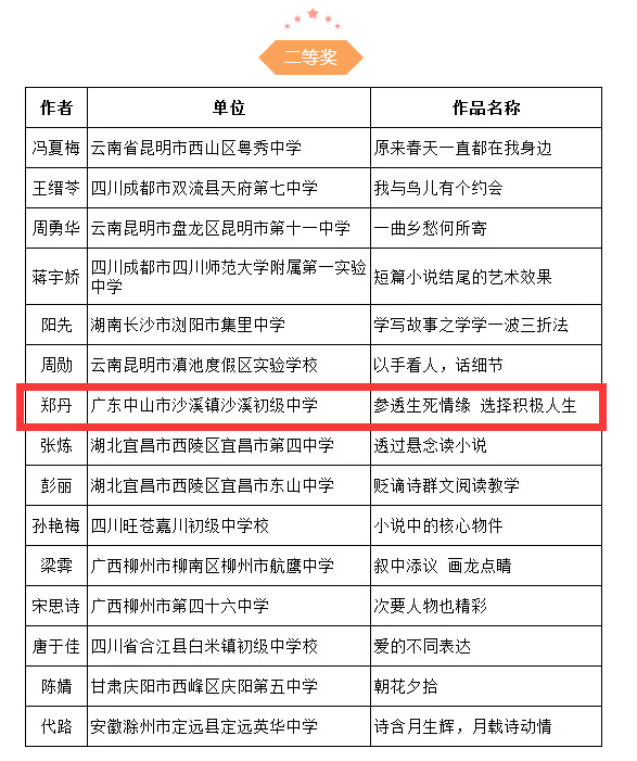 全國(guó)第四屆初中群文閱讀錄像課大賽和教學(xué)設(shè)計(jì)大賽于4月10日?qǐng)A滿(mǎn)結(jié)束,沙溪中學(xué)鄭丹老師榮獲全國(guó)第四屆“初中群文閱讀錄像課大賽”二等獎(jiǎng)和教學(xué)設(shè)計(jì)優(yōu)秀獎(jiǎng)。