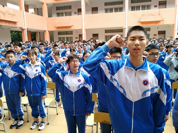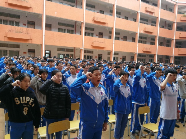 聽完領(lǐng)導(dǎo)和老師的講話,同學(xué)們個個精神振奮、倍受鼓舞。在陳曉潼、楊栩兩位同學(xué)的帶領(lǐng)下,大家進行了激情澎湃的宣誓,字字鏗鏘,響徹校園。