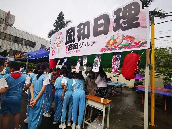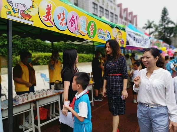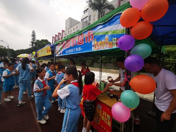 每位同學都興致勃勃地參加自己喜歡的活動,興奮地拿到美食券去美食區(qū)兌換美食。每個班級一個美食攤位,來自五湖四海的美食佳肴滿足不同孩子的口味需求,有甜絲絲的西米露糖水、燒仙草,有火辣辣的風味雞腳和涼面,有人氣十足的炸薯條和日本料理,更有冰爽的雪糕冰棒… …數不勝數,令人眼花繚亂。