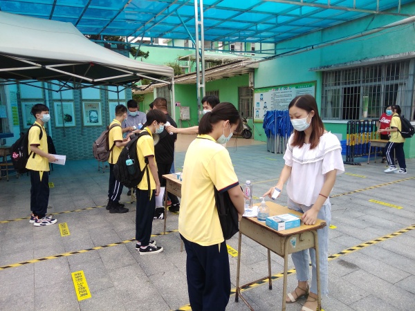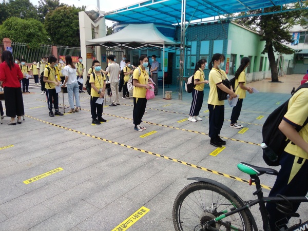 早上,學(xué)校行政和教師已經(jīng)在校門迎候返校的同學(xué)們,提前準(zhǔn)備好四個入校通道,準(zhǔn)備測溫用的額溫槍,免洗消毒液,值日教師到崗。學(xué)校行政和責(zé)任交警一起負(fù)責(zé)疏導(dǎo)校門口的交通秩序,引導(dǎo)同學(xué)們保持好間距排隊,接受值日老師的測溫和掃碼,一切正常才能順利進(jìn)校。