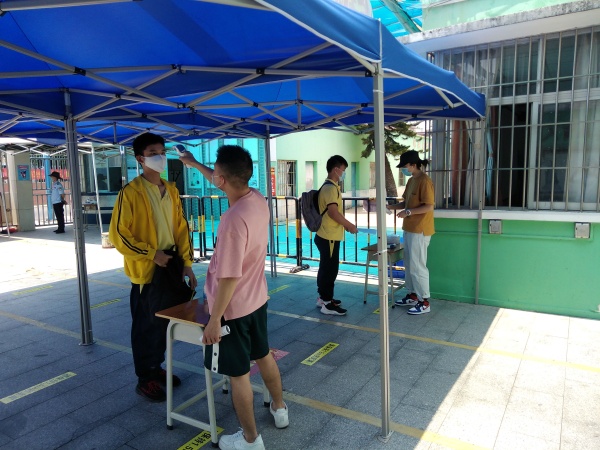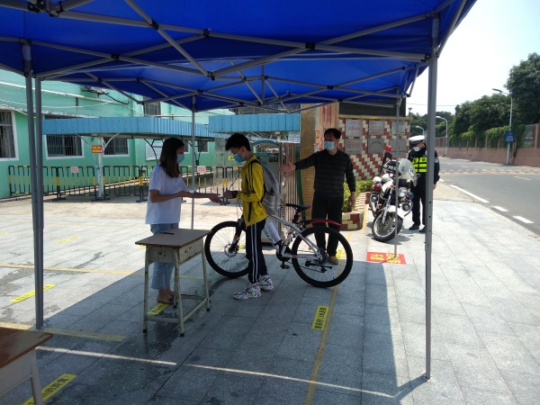 12:00剛過,負(fù)責(zé)進(jìn)行交通疏導(dǎo)的公安民警早早來到校門口,以防接送學(xué)生的車輛在校門口發(fā)生擁堵。12:30分后,同學(xué)們陸續(xù)來到學(xué)校,按照地面張貼的引導(dǎo)標(biāo)線來到進(jìn)校通道,老師先掃同學(xué)們粵康碼,正常后,再到體溫測(cè)檢測(cè)處,測(cè)體溫正常,進(jìn)行手部消毒,然后才能進(jìn)入校園。