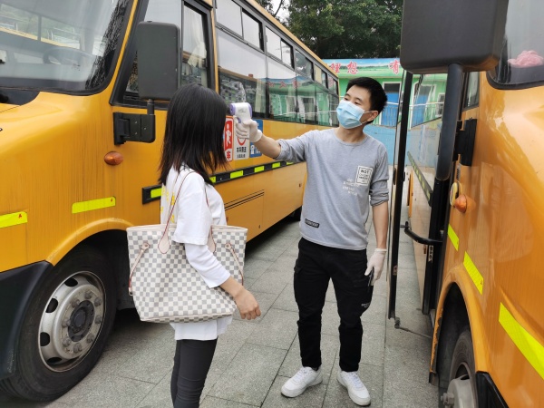 第四個場景是乘坐校車。校車到點,教師下車,先對學生測體溫,測溫正常后上車。如果體溫異常,跟車老師馬上跟家長聯(lián)系,要求接回孩子,赴醫(yī)院就診,老師陪伴等待家長到來,然后老師向主管行政報告,再由主管行政繼續(xù)跟進。