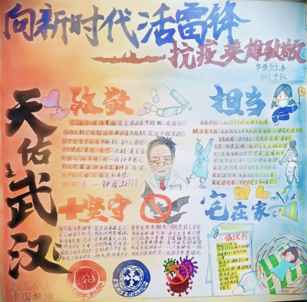 華強(qiáng)少工委的少先隊(duì)員們,看著那一個(gè)個(gè)舍生忘死的逆行者,看著那一幕幕催人淚下的畫面,無不讓隊(duì)員們肅然起敬,云隊(duì)會之后,華強(qiáng)的隊(duì)員們用稚嫩的畫筆,畫出那英雄的背影,用虔誠的心寫下那先鋒的故事。