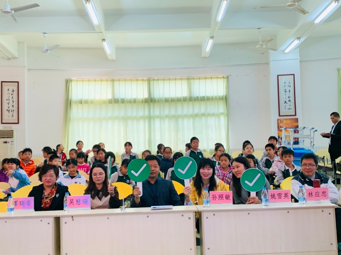大賽伊始,由主持人楊羽辰老師介紹比賽流程、說明比賽規(guī)則,宣布比賽正式開始。比賽采用淘汰制,來自神灣中心小學(xué)、神舟學(xué)校和育才學(xué)校的三支參賽隊伍,共12名學(xué)生,按照事先商定好的出場序號,依序輪流進行現(xiàn)場詞語單字的聽寫,由黃紹平老師、姚雪英老師、孫照敏老師和吳慧珊老師組成的評委團根據(jù)出示的正確答案進行舉牌裁定。
