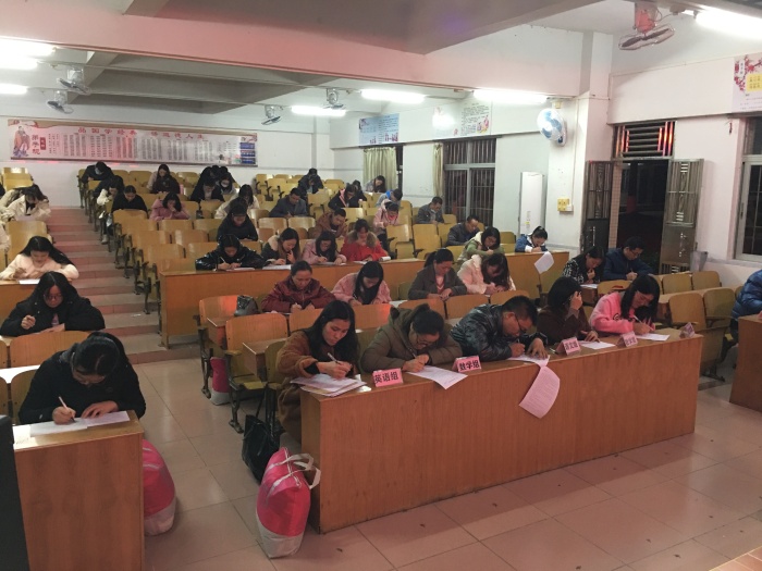 本次測(cè)試分為小學(xué)語(yǔ)、數(shù)、英各組,以及中學(xué)文綜組、理綜組和英語(yǔ)組,近100名教師參賽,各組使用不同的試卷,由學(xué)校教務(wù)處統(tǒng)一命題,專組專用,小學(xué)語(yǔ)文組以理論和實(shí)際相結(jié)合,有教育理論、拼音字詞、經(jīng)典詩(shī)詞、中外名著等常識(shí),也有語(yǔ)文教學(xué)案例分析;數(shù)學(xué)組以趣味數(shù)學(xué)、思維訓(xùn)練為中心命題;英語(yǔ)組主要圍繞教師語(yǔ)法知識(shí)練習(xí)與提升擬定內(nèi)容。中學(xué)各組主要圍繞往屆中考題型為中心來(lái)命題,讓老師們進(jìn)一步對(duì)中考題型的滲透。全體教師在無(wú)通訊設(shè)備的環(huán)境下進(jìn)行解題,從晚上8時(shí)至9時(shí),老師需在1小時(shí)內(nèi)完成答題,分別由學(xué)校教務(wù)處高華副校長(zhǎng)和韋紹祖主任負(fù)責(zé)監(jiān)考。老師們?cè)谀玫皆囶}后,都奮筆疾書(shū),時(shí)而握筆沉思,時(shí)而埋頭寫字,看老師們認(rèn)真答題的樣子,大家應(yīng)該是做好了充分的準(zhǔn)備,對(duì)自身的專業(yè)知識(shí)技能是胸有成竹的。
