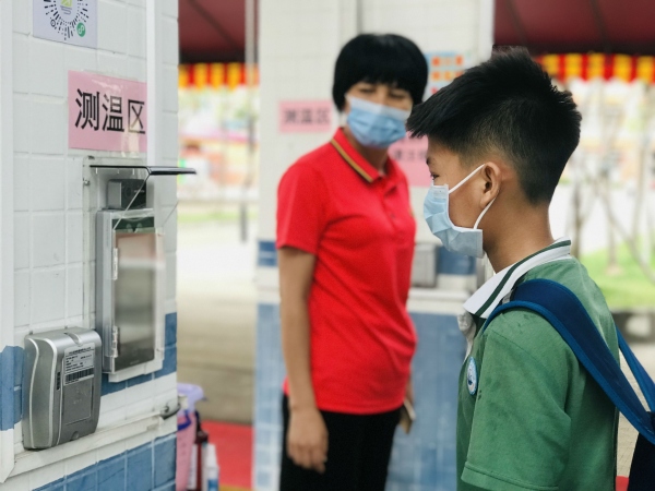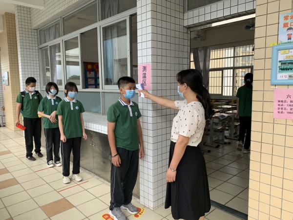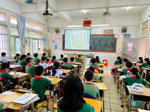 溫情的迎接禮后,各班班主任、副班主任早已面戴口罩、手拿測溫槍,在課室門口等待已久。必要的入班檢查后,學(xué)生們端正坐在熟悉的課室里,迎來了這場與以往有所不同的開學(xué)典禮。耳邊響起熟悉的國歌,隊員們整齊的敬禮,同學(xué)們在視頻里接受了譚瑞香校長的開學(xué)祝福,在班主任的組織下觀看了復(fù)學(xué)第一課視頻、學(xué)習(xí)了一日生活指南等,神采奕奕又充滿專注的雙眼里,寫滿了對課堂、對學(xué)習(xí)的渴望。