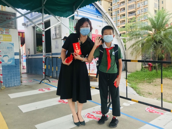 得益于前期返校準(zhǔn)備工作的踏實開展、有效落實,盡管半程下起了小雨,但整個返校過程依然順利而又流暢,完美詮釋了劉勰先生的那句“千曲而后曉聲,觀千劍而后曉器”。中山市教育工委疫情防控黨員服務(wù)隊工作人員李衛(wèi)政同志在作為路隊返校學(xué)生入口的東門門口,查看了學(xué)校入校測溫區(qū)的設(shè)置、學(xué)生進(jìn)校的監(jiān)測管理流程等,譚瑞香校長、梁海英副校長用親切的笑容、溫和的語言和得體的手勢,迎接學(xué)生的到來,指引他們在制定的班級區(qū)域排隊等候,遵照路面指示保持間距,按要求測量體溫,并貼心地為每一位返校學(xué)子準(zhǔn)備發(fā)放了開學(xué)禮物:一份校長寄語,包含的是對他們返校的歡迎和期盼;一支糖果,表達(dá)的是對他們學(xué)習(xí)生活的祝福和希望。一句親切的“歡迎回來”、一個簡單的“開學(xué)紅包禮”,傳遞了上級領(lǐng)導(dǎo)們的關(guān)心和重視,傳達(dá)出師生期盼已久終于相見的喜悅,學(xué)生們也為這真誠的熱情所感動、為學(xué)校溫馨和諧的氣氛所感染,一個個臉上展露出靦腆卻依然溫暖的笑容。見此情景,李衛(wèi)政同志說道,禮物雖小但情意濃厚,為細(xì)心的神小家庭、幸福的神小學(xué)子點贊。